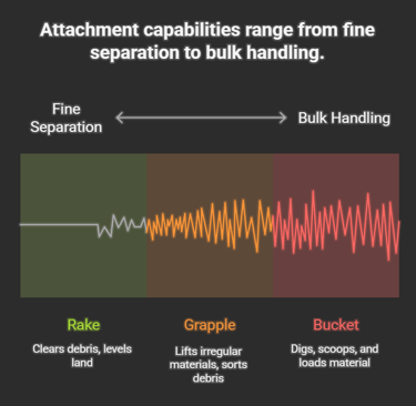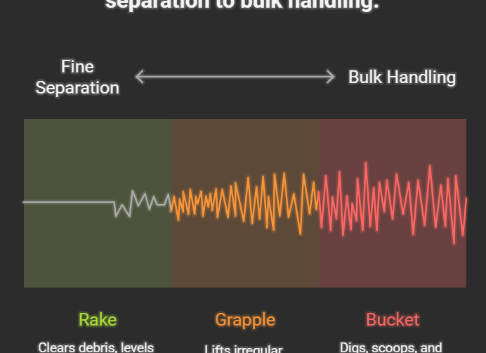 Verdict: If you need clean, selective clearing and soil preparation, the rake wins hands down. But for heavy lifting and gripping, the grapple is unbeatable, while buckets remain the go-to for excavation work.